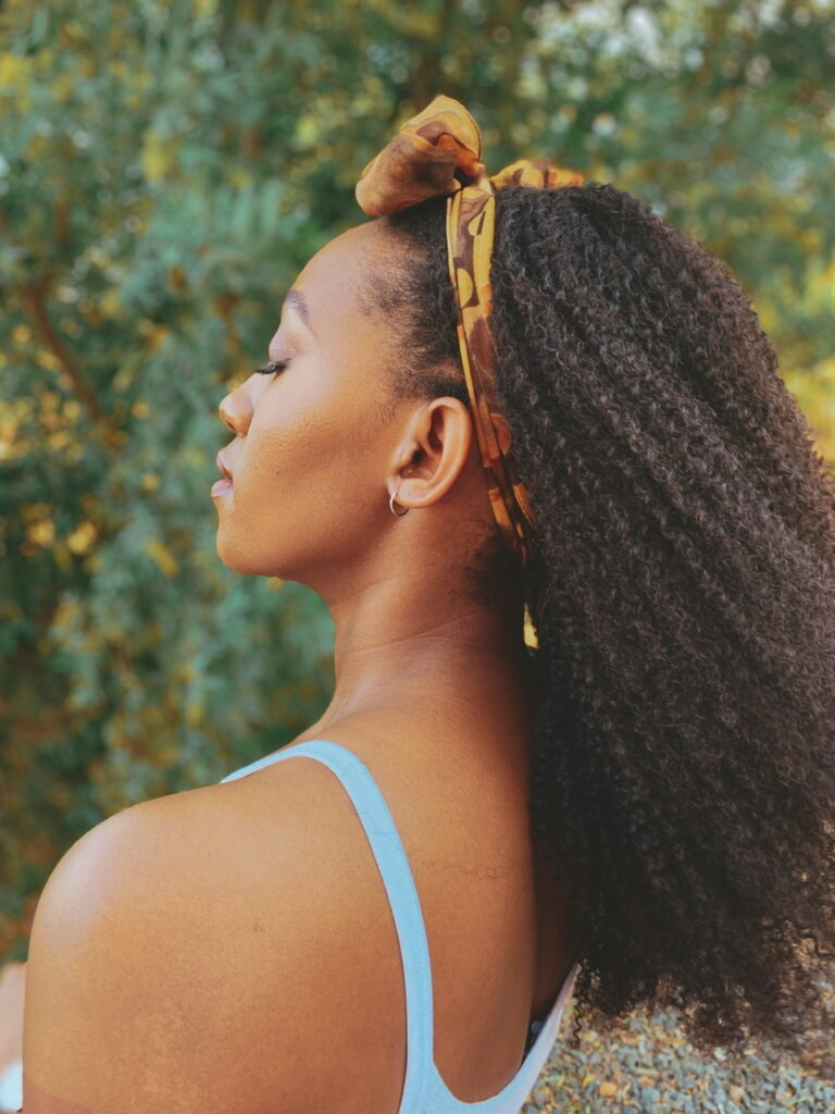 As I’ve mentioned, I am still getting used to how I look with a wig on because I’ve had 9 years of just staring at my natural hair in protective up-dos. I decided to ease myself in by turning this 20-inch lace front wig into a half-head wig, or a headband wig if you will. This is to allow my natural hair to be visible so it’s not as big a shock. It also protects my edges because I don’t have to use glue or anything else to lay the wig down. I put my hair in twists underneath the wig and I make sure they’re properly hydrated as the wig cap is stocking material which tends to suck up a lot of moisture.